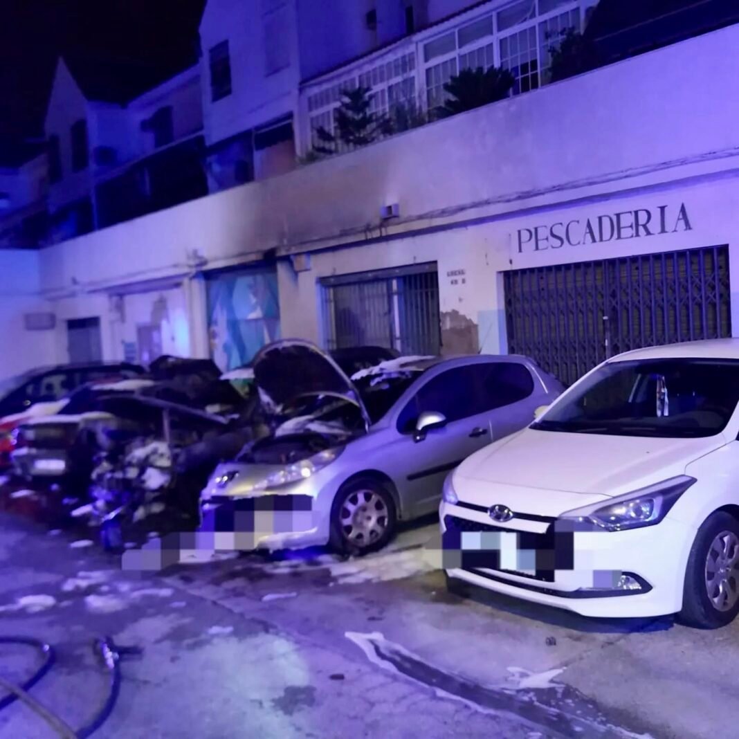 En la noche de ayer, los bomberos de Dos Hermanas intervinieron en la extinción del Incendio de varios vehículos aparcados,