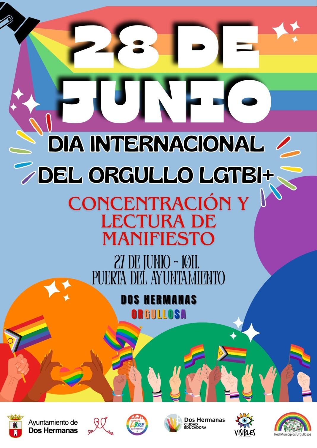 Por este motivo, el próximo viernes, día 27 de junio, a las 10:00 horas, el Ayuntamiento de Dos Hermanas, en colaboración con la asociación Visibles 2H, convoca una CONCENTRACIÓN en la puerta del Ayuntamiento, en la que se dará lectura al manifiesto por los derechos de las personas LGTBI+ y se invita a la ciudadanía nazarena a que se sume a esta conmemoración, recordando que «es un día para celebrar el “Orgullo”, el orgullo de quienes somos y el orgullo de ser una sociedad diversa».